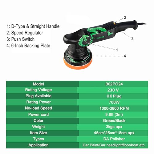 🎖️【Unique Design & Ergonomic Design】 BATOCA professional design team is dedicated to creating something new and different car buffers and polishers. Unlike regular buffer polisher, a green chameleon encircles the body of our BATOCA DA polisher. It is unprecedented cool and helps to make your car cool and shiny. Comfortable front grip, curved body sense handle is not easy to fatigue, more accurate operation.