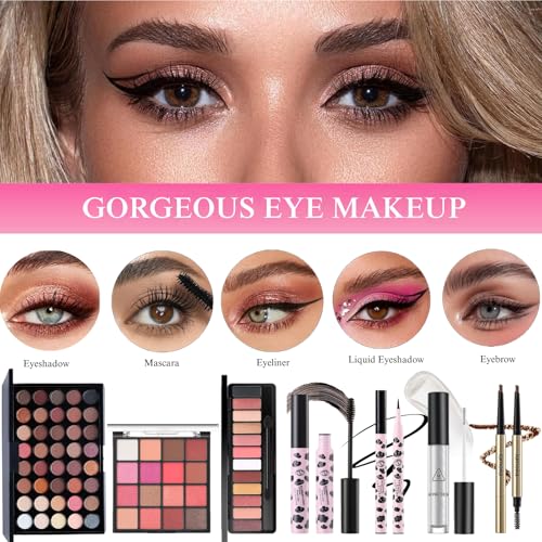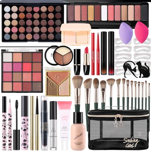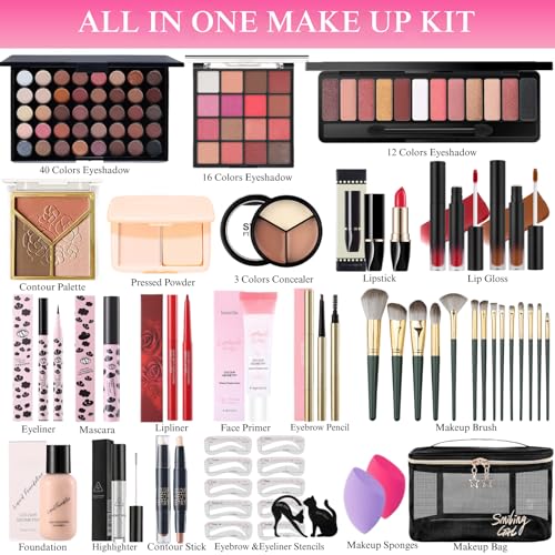 All-in-One Makeup Kit for Women, Complete Makeup Gift Set for Teen Girls, Essential Makeup Bundle with Eyeshadow Palette, Mascara, Contour, Lipstick, Cosmetic Brushes & Travel Bag