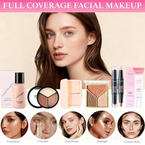 All-in-One Complete Makeup Kit: This comprehensive makeup kit includes everything you need for a flawless daily look: 3pcs eyeshadow palette, foundation, face primer, contour stick, concealer palette, pressed powder, lipstick, 2pcs lip glosses, lip liner, eyeliner, eyebrow pencil, mascara, highlighter, 2pcs makeup sponges, 10pcs eyebrow stencils, a full set of makeup brushes, and a travel-friendly makeup bag. With all essentials in one place, this set allows you to achieve a professional full-face makeup look with ease and confidence.
