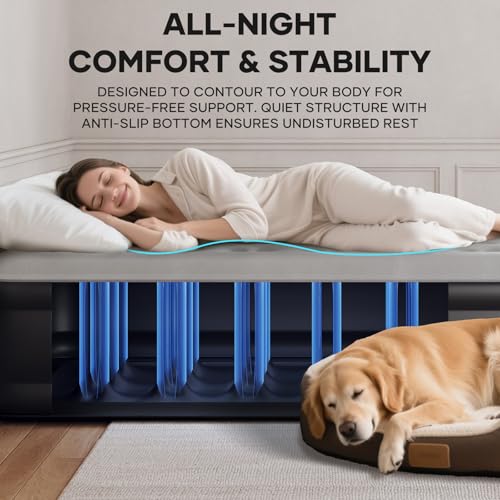 𝐒𝐭𝐚𝐛𝐥𝐞 𝐃𝐞𝐬𝐢𝐠𝐧: At 46cm high, this air mattress is easy to get on and off—ideal for those with limited mobility. The anti-slip bottom keeps it securely in place on any floor type, ensuring a stable and safe night’s sleep