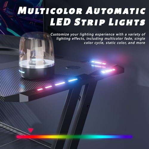 Gaming Desk with LED Lights, 120 x 60 cm Gaming Table Z Shaped, Gamer Desk with Carbon Fiber Coated, Gaming PC Table with Headphone Hook and Cup Holder, Computer Desks Easy to Assemble, Black