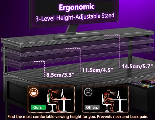【Ergonomic Monitor Stand】The gaming desk includes a adjustable monitor bracket engineered for ergonomic support. With three adjustable height settings, you can easily find the most comfortable and perfect viewing angle, helping to prevent neck and back strain during extended gaming sessions.