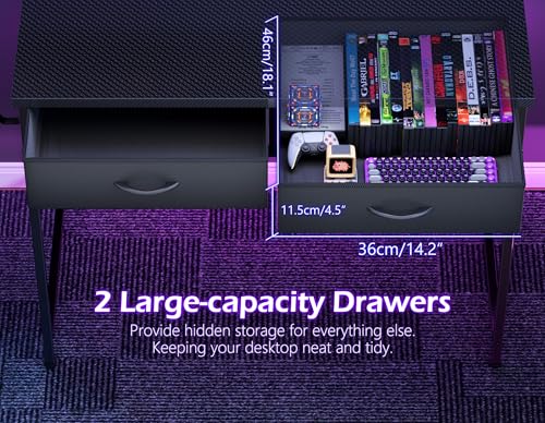 【Spacious and Functional Desk】The gaming desk is designed for practicality, featuring two spacious fabric drawers that offer ample storage for your tech accessories, documents, or stationery. In addition, it is equipped with a hook to hang headphones or others. The ample storage space makes it easy to keep space neat and organized. Dimensions: 80cm (L) x 48cm (W) x 77.5cm (H).