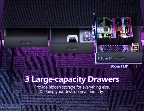 【Spacious and Functional Desk】The gaming desk is designed for practicality, featuring three spacious fabric drawers that offer ample storage for your tech accessories, documents, or stationery. In addition, it is equipped with a hook to hang headphones or others. The ample storage space makes it easy to keep space neat and organized. Dimensions: 100cm (L) x 50cm (W) x 77.5cm (H).