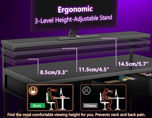 【Ergonomic Monitor Stand】The gaming desk includes a adjustable monitor bracket engineered for ergonomic support. With three adjustable height settings, you can easily find the most comfortable and perfect viewing angle, helping to prevent neck and back strain during extended gaming sessions.