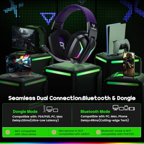 🔄【Seamless Dual-Mode Wireless】Switch effortlessly between 2.4GHz dongle mode for PS5, PS4, PC, Switch & Mac, and Bluetooth mode for Playstation 5 Accessory Kits, PC, Mac, Switch, mobiles, laptops & tablets by pressing the mic button for 2 seconds. One gaming headset wireless, en,dless gaming possibilities.❌ Note: Both modes are NOT compatible with Xbox.⚠️ The microphone is NOT compatible with Switch.🚫 Bluetooth mode is NOT compatible with PS4/PS5.