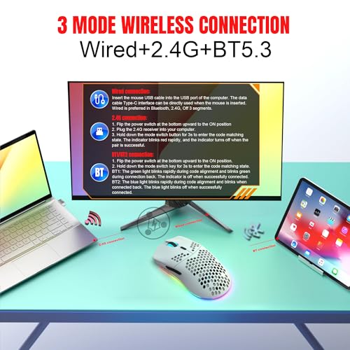 T66 PC Gaming Mouse, BT/2.4G Wireless/Wired, Lightweight Honeycomb Shell, Macro Program, Cool RGB Light, 650mAh Large Battery, 3600 DPI, for PC Gamer -White