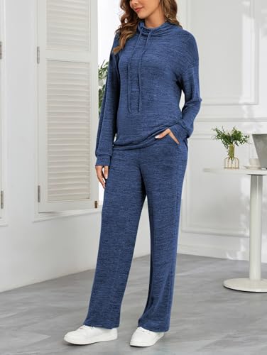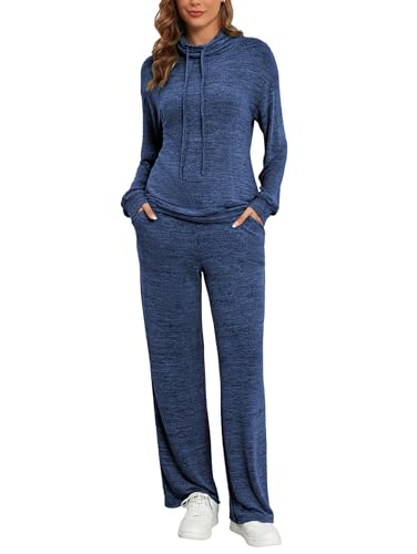 Famulily Cowl Neck Womens Tracksuit Sets Drawstring Long Sleeve Pullover Top and Elastic Waist Wide Leg Pants with Pockets