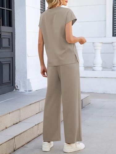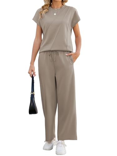 Famulily Tracksuit Womens Full Set Crew Neck Pleated Top & Elastic Wide Leg Pants Summer 2 Piece Outfits with Pockets S-XXL