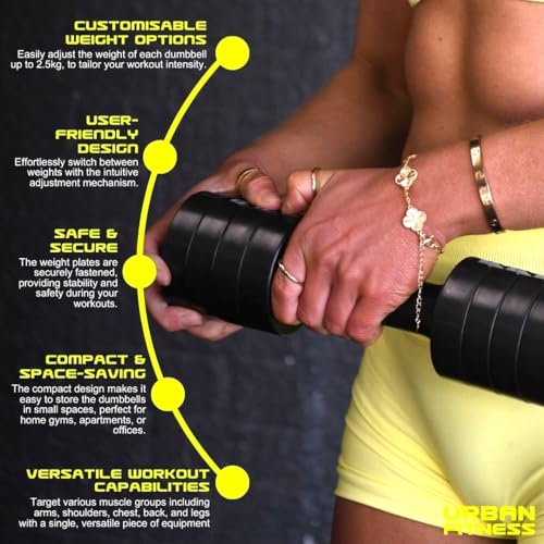 CUSTOMISABLE WEIGHT OPTIONS: Easily adjust each dumbbell up to 2.5kg, allowing you to tailor your workout intensity to your specific fitness goals. Perfect for beginners and advanced users seeking versatile strength training at home or on the go.