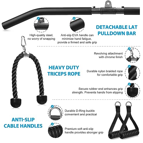【Professional materials】Cable pulley system home gym made of heavy-duty materials, the extended pin can hold maximum load up to 300 lbs. The lat pulley system made of steel for abrasion resistance, reducing any chance of breakage and without noise during operation.