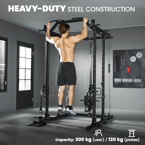 Versatile home gym equipment: Pair it with a weight bench for fly, dumbbell press and rowing exercises. The integrated pull-up bar offers multiple grips and doubles as a squat rack.