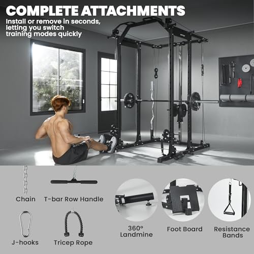 Complete attachments: Comes with two resistance bands, a triceps rope, a chain, a T-bar row handle, two J-hooks, a 360° landmine and a footboard. All accessories attach and detach with ease, maximising your cable machine’s functionality.