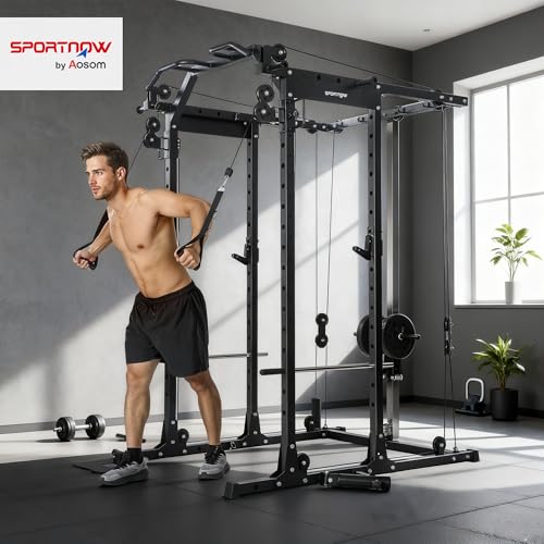 SPORTNOW Cable Crossover Machine, Multi Gym Cable Pulley System with Pull Up Bar, Lat-Pull Down System, Landmine & T Bar, 300kg All-in-One Power Cage Squat Rack for Home Gym Strength Training