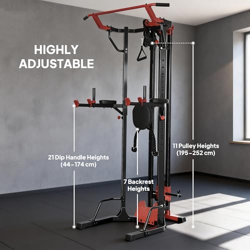 Highly adjustable for precise training: Features 21 dip handle height adjustment positions and 11 pulley height settings. Easily adapts to different body types and exercises for optimal training angles and muscle activation
