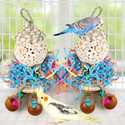 BBjinronjy 2PCS Bird Toys Parrot Foraging Shredder Hanging Toys Sola Balls with Bell for Small Parrots, Parakeets, Cockatiel, Conures, Love Birds, Budgie Cage Toy (Hat Girl Big) (Natural Hats)