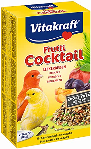 2 X 200G VITAKRAFT CANARY FRUTTI COCKTAIL IN A VALUE 2 PACK WITH A SUGAR FREE RECIPE WITH EXTRA VITAMINS & MINERALS IDEAL FOR CANARIES A MIX OF DELICIOUS FRUITS & SUN-RIPENED SEEDS A CRUNCHY TREAT SURE TO KEEP YOUR PET ENTERTAINED FOR HOURS BEST SERVED AS A SNACK TO SUPPLEMENT PRIMARY FOOD INDIVIDUAL PACKET WEIGHT: 200G PLEASE NOTE ALL MEASUREMENTS ARE APPROX