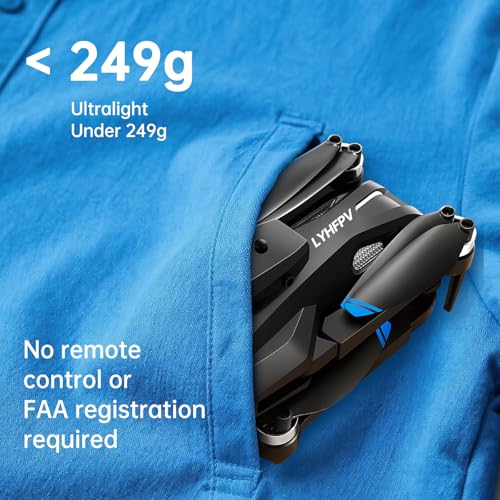 【Lightweight and Stable Hover】The LYHFPV drone weighs less than 249g,no need for FAA and remote ID registration.The Foldable drone built-in brushless motor delivers a smooth and stable videos even in high-speed or strong-wind conditions