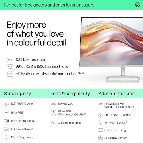 HEIGHTEN YOUR COMFORT: From working through crunch time to focusing on you-time, this 23.8″ FHD monitor lets you customize your comfort with a height-and tilt-adjust stand, the Ergonomic Setup Guide gets you started by giving you customized comfort right at your fingertips in HP Display Centre, plus, HP Eye Ease with Eyesafe certification limits blue light to keep your eyes comfortable without impacting colour accuracy